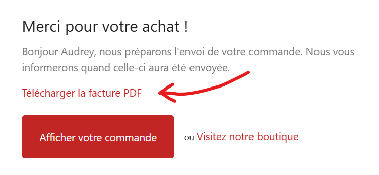 À titre informatif, tu peux la retrouver à partir du courriel de confirmation que tu as reçu après avoir placé ta commande. Suffit de cliquer sur le lien « Télécharger la facture PDF » qui se trouve un peu plus bas dans le corps du message (voir la capture ci-dessous), puis d'enregistrer le fichier sur ton téléphone ou sur ton ordinateur.